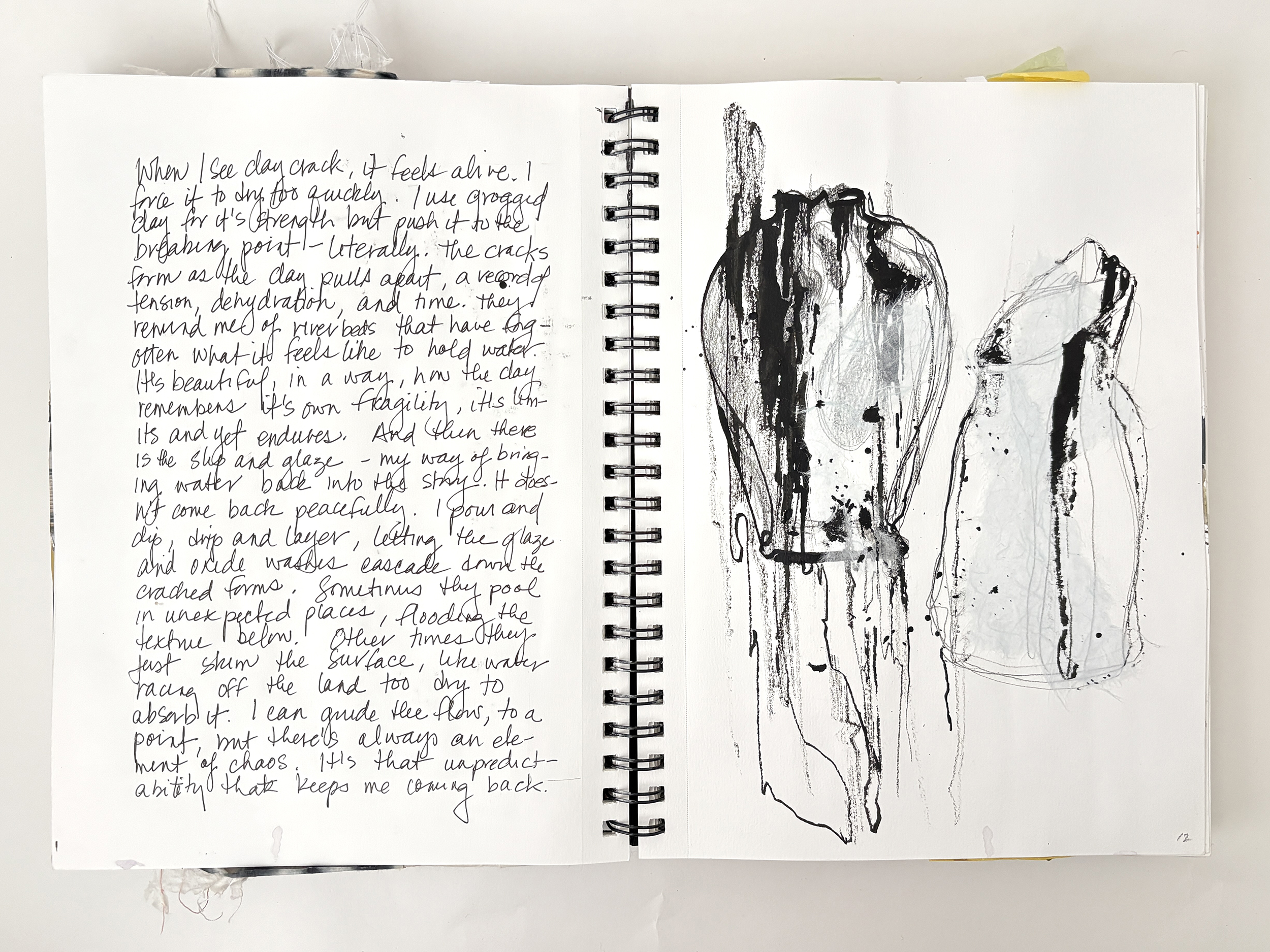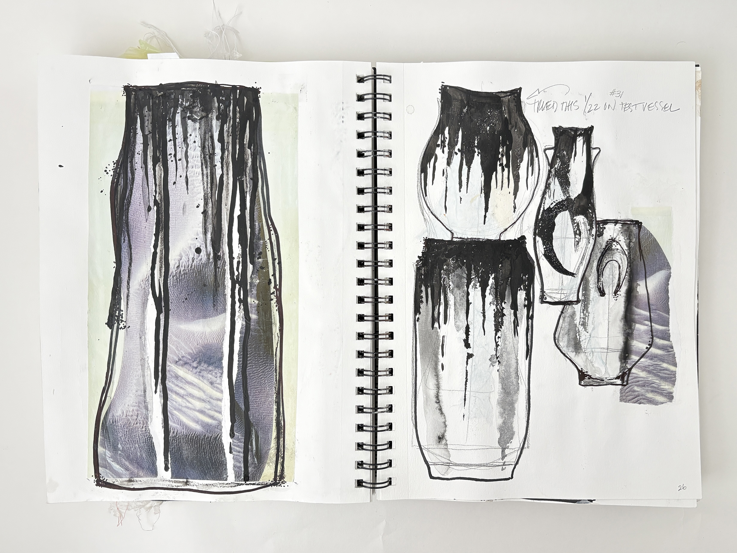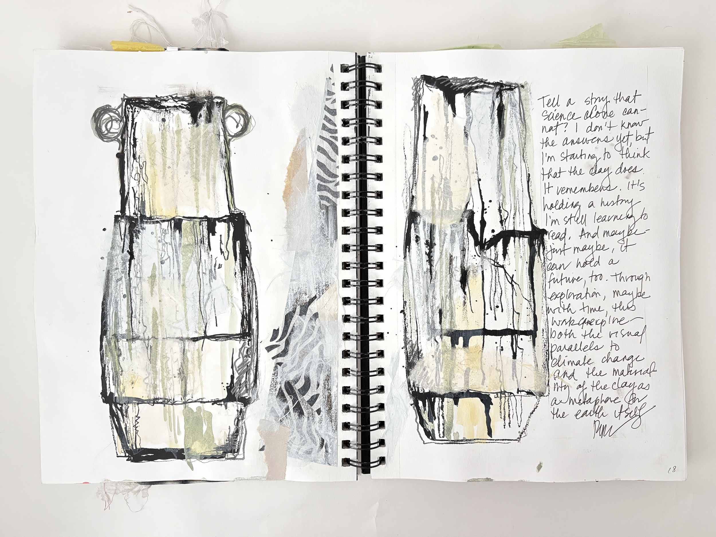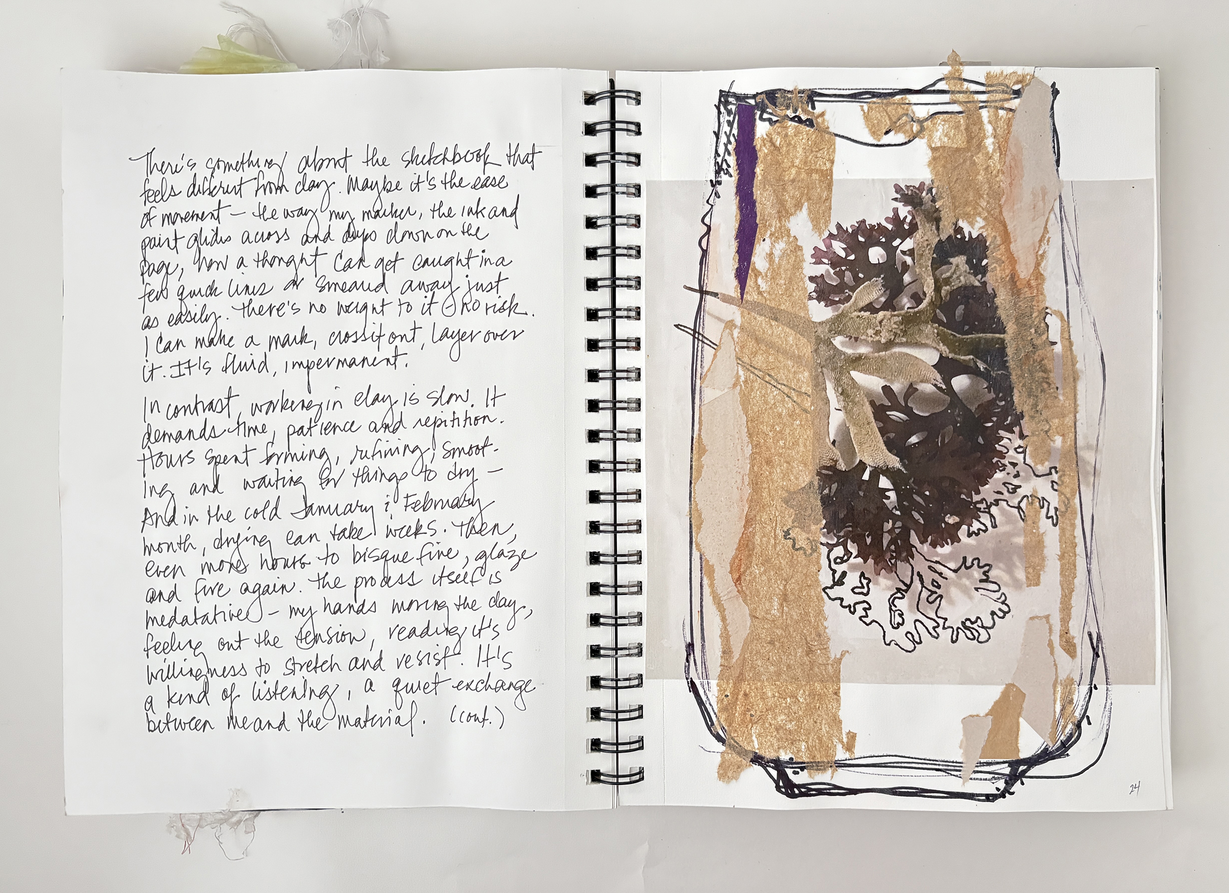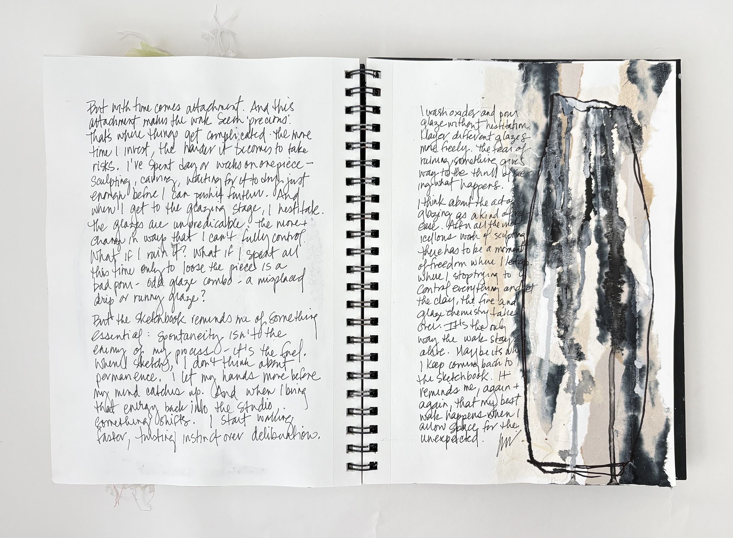 I use my sketchbooks to loosen up. This is a layered process, much like my ceramic work. I begin with collage—fragments of printed photos (most of them are from my phone), torn paper, and found objects—then drawing layers in marker and pencil before adding ink, water color, and guache that drip, bleed, and flow unpredictably, echoing the movement of glaze on clay. This space allows for spontaneity, a place to experiment before bringing ideas into the studio. The interplay of control and chaos keeps the work alive, pushing me to embrace the unexpected. These pages are a record of exploration, a reminder that creativity thrives in letting go and responding to what emerges.