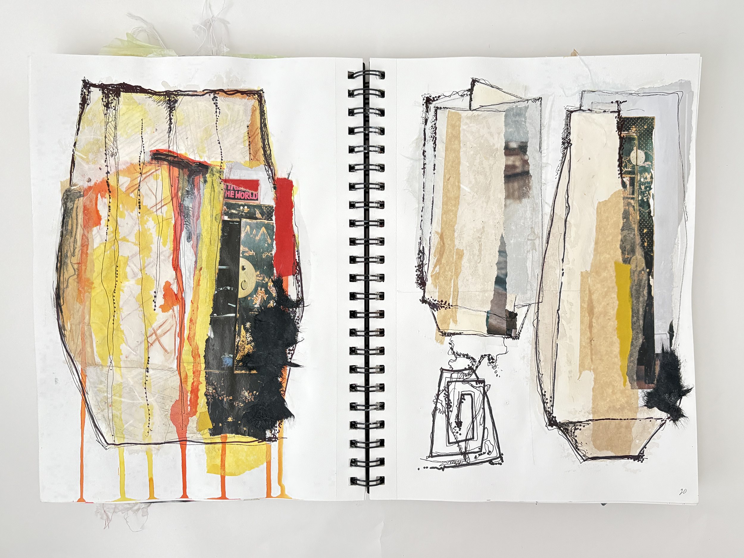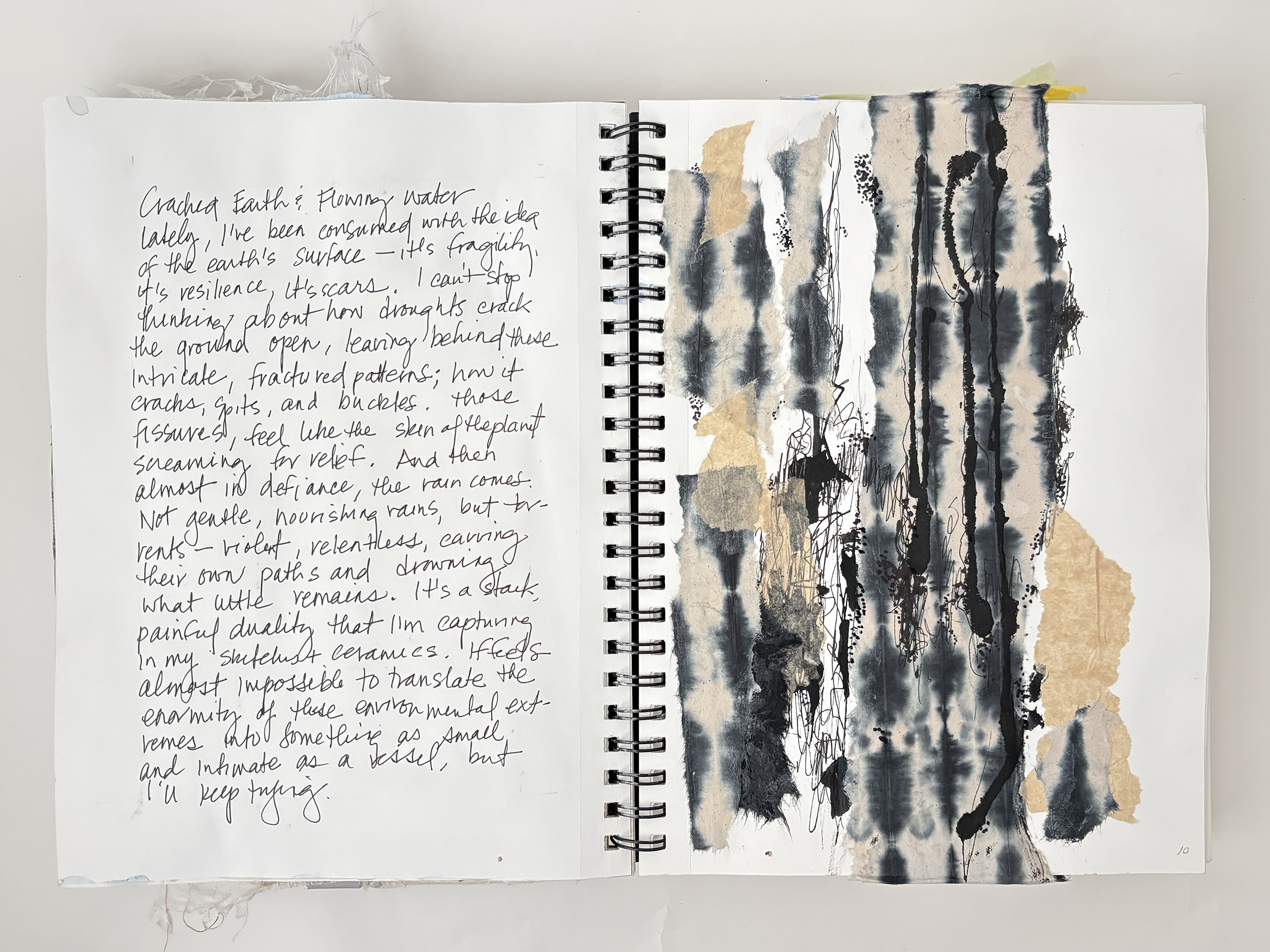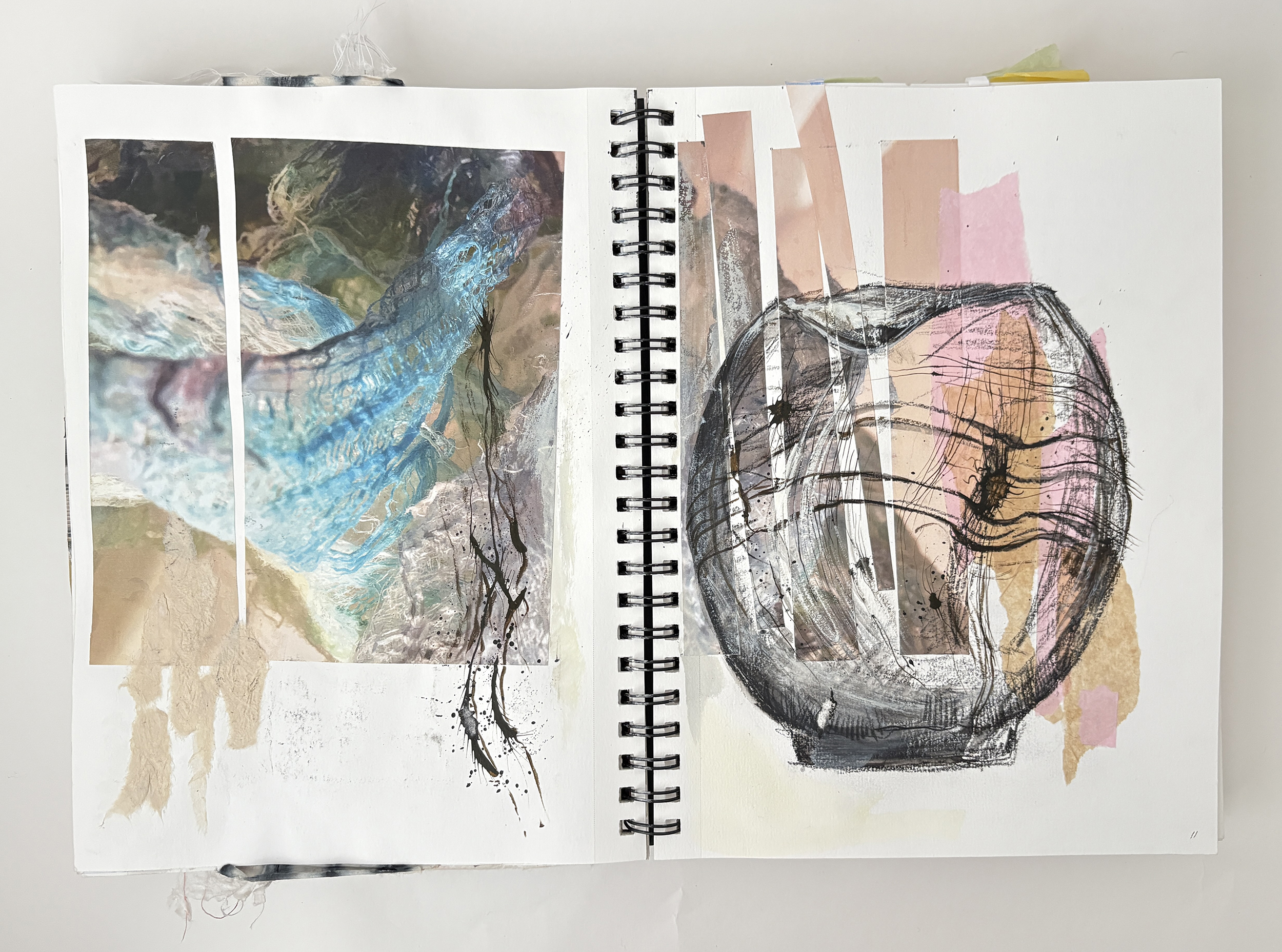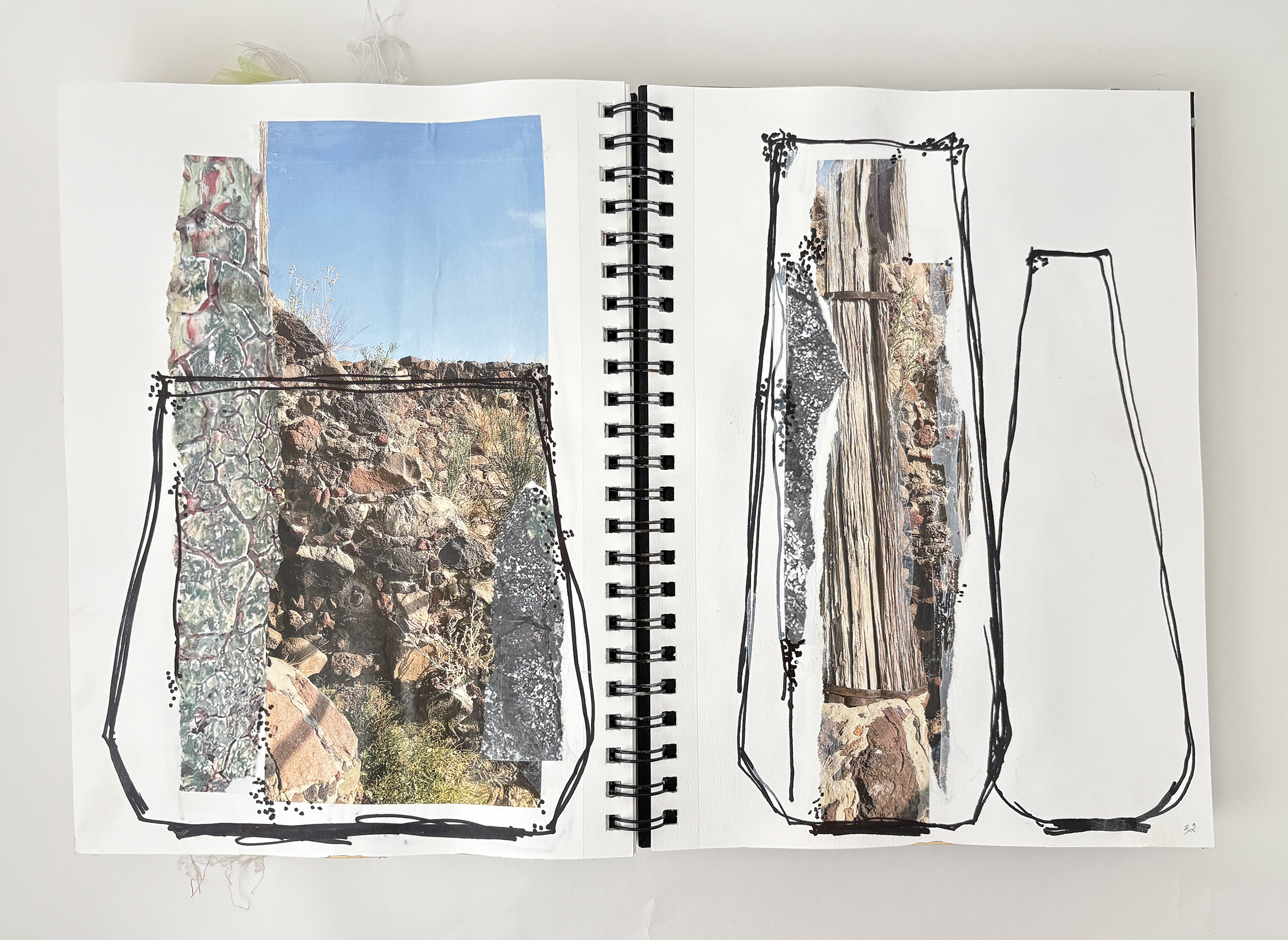 I use my sketchbooks to loosen up. This is a layered process, much like my ceramic work. I begin with collage—fragments of printed photos (most of them are from my phone), torn paper, and found objects—then drawing layers in marker and pencil before adding ink, water color, and guache that drip, bleed, and flow unpredictably, echoing the movement of glaze on clay. This space allows for spontaneity, a place to experiment before bringing ideas into the studio. The interplay of control and chaos keeps the work alive, pushing me to embrace the unexpected. These pages are a record of exploration, a reminder that creativity thrives in letting go and responding to what emerges.