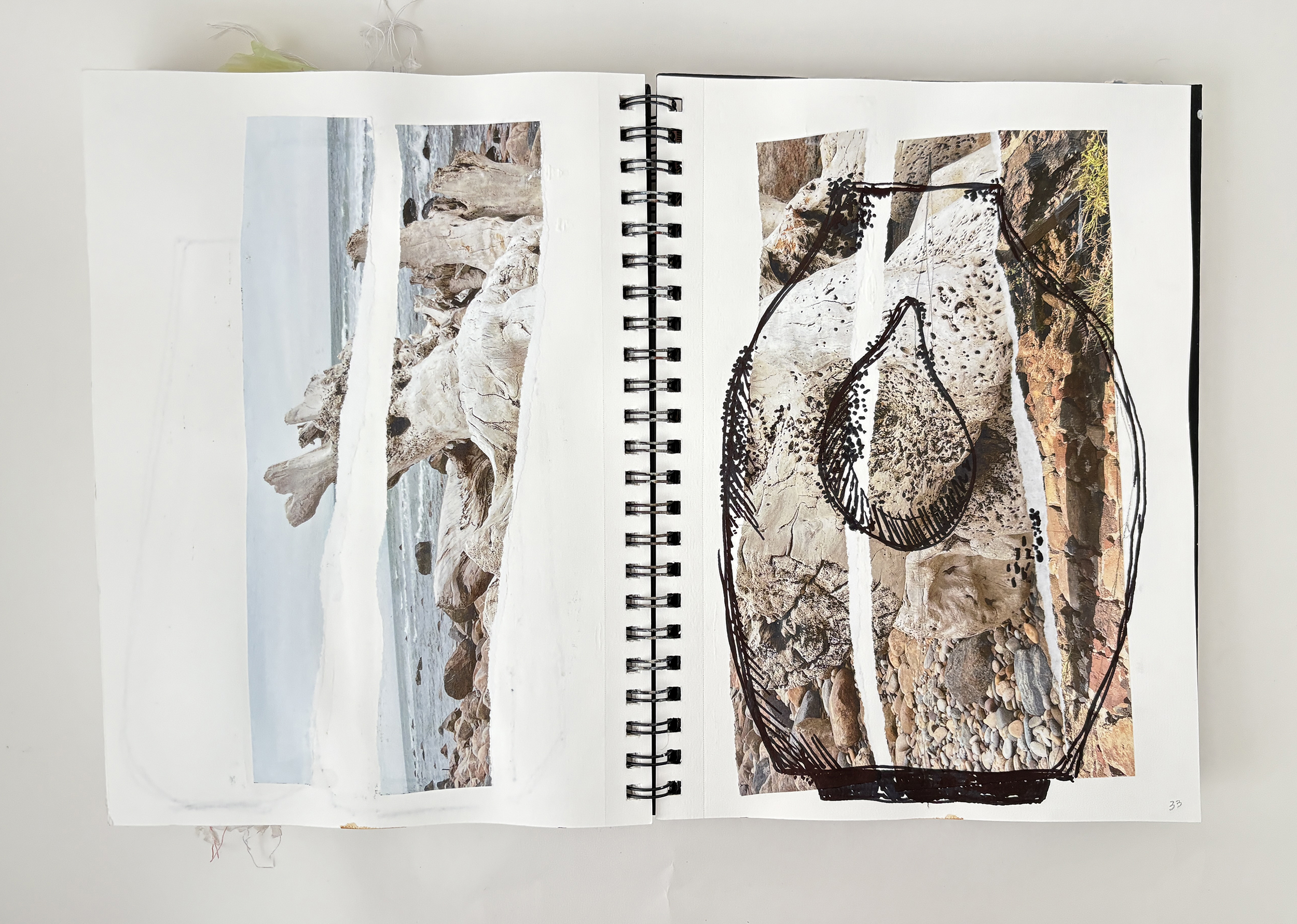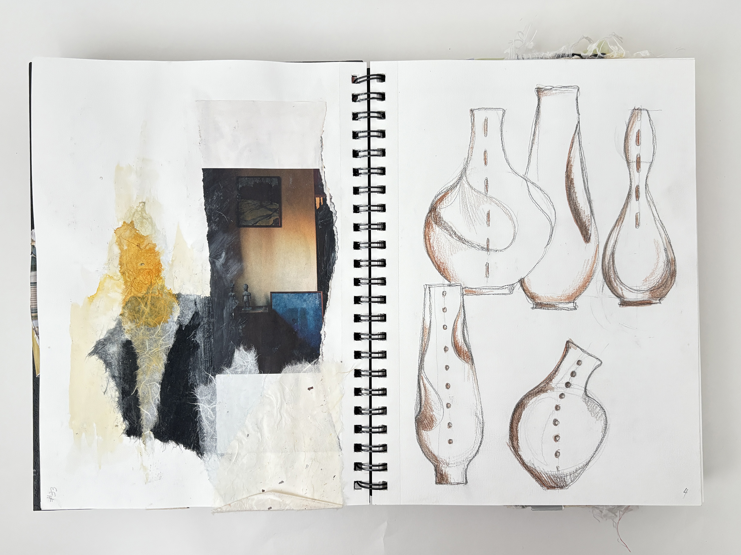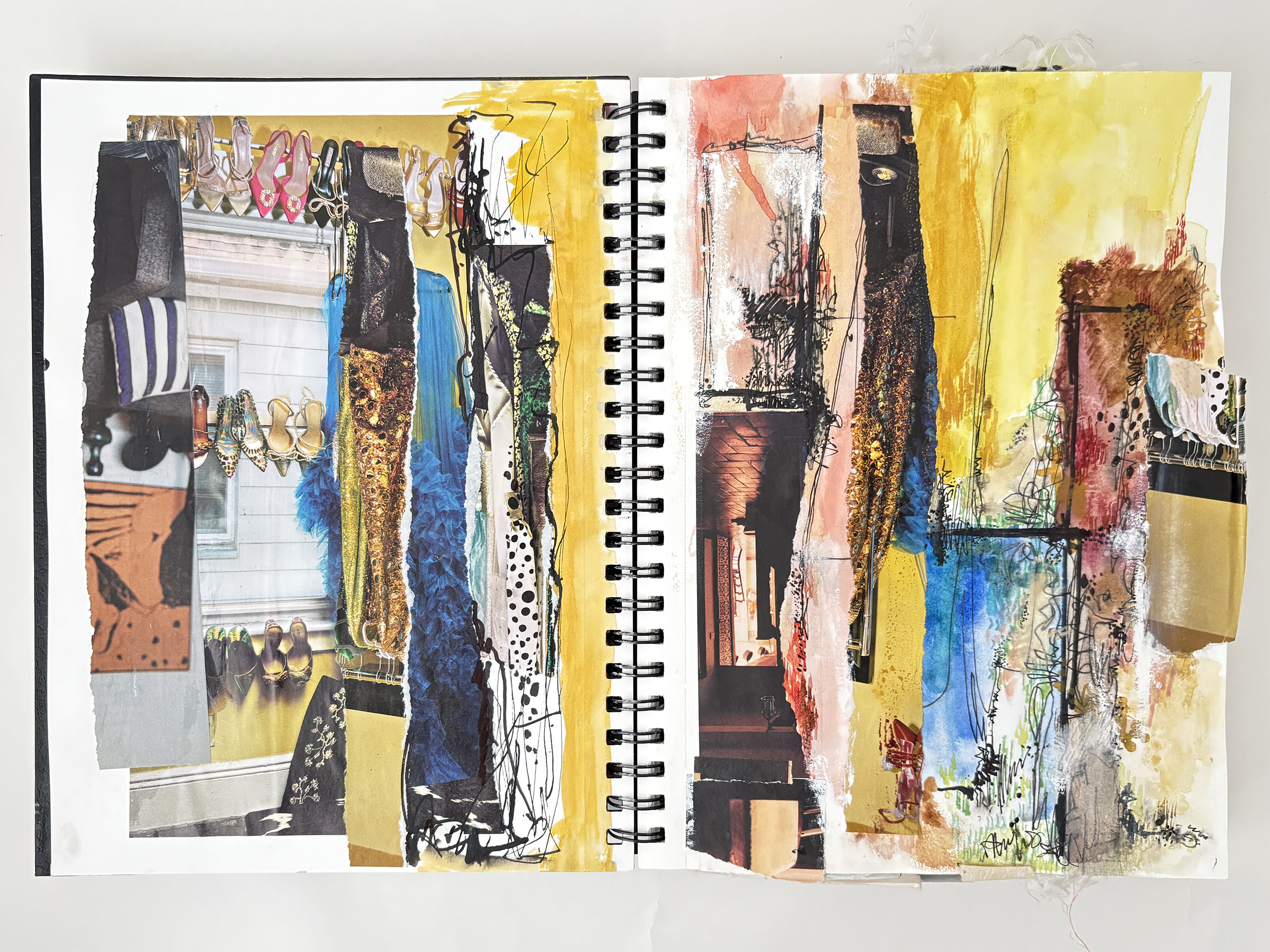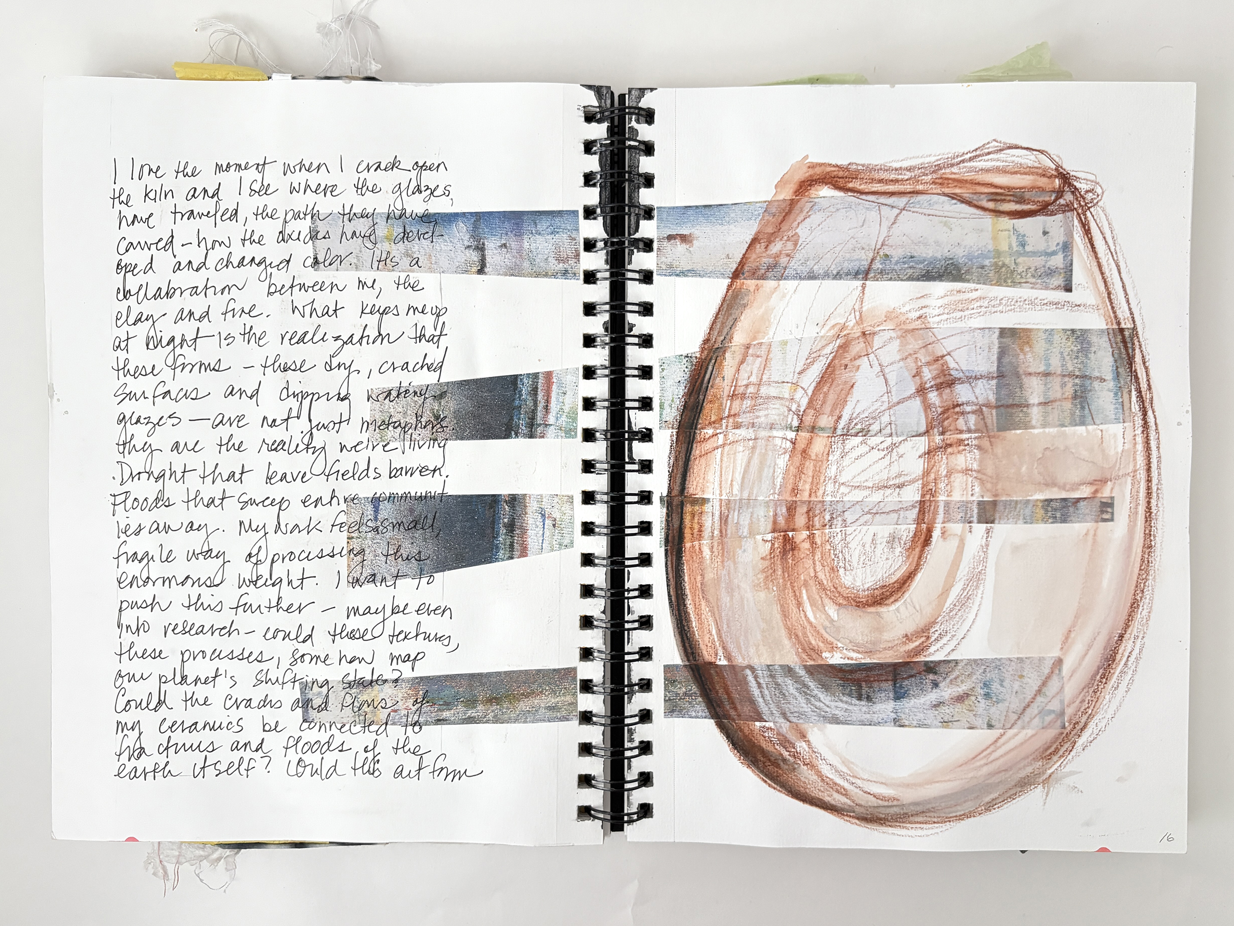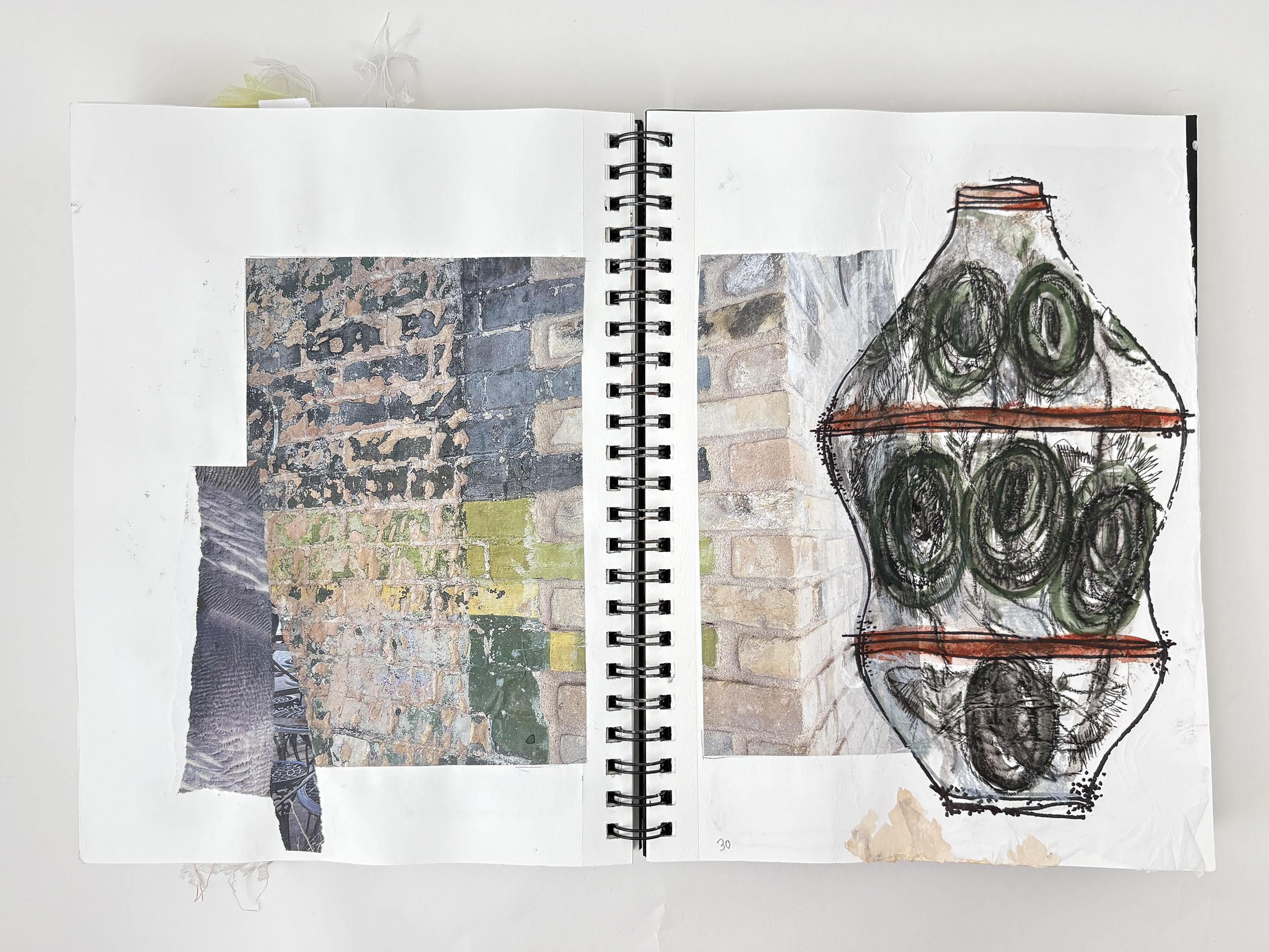 I use my sketchbooks to loosen up. This is a layered process, much like my ceramic work. I begin with collage—fragments of printed photos (most of them are from my phone), torn paper, and found objects—then drawing layers in marker and pencil before adding ink, water color, and guache that drip, bleed, and flow unpredictably, echoing the movement of glaze on clay. This space allows for spontaneity, a place to experiment before bringing ideas into the studio. The interplay of control and chaos keeps the work alive, pushing me to embrace the unexpected. These pages are a record of exploration, a reminder that creativity thrives in letting go and responding to what emerges.