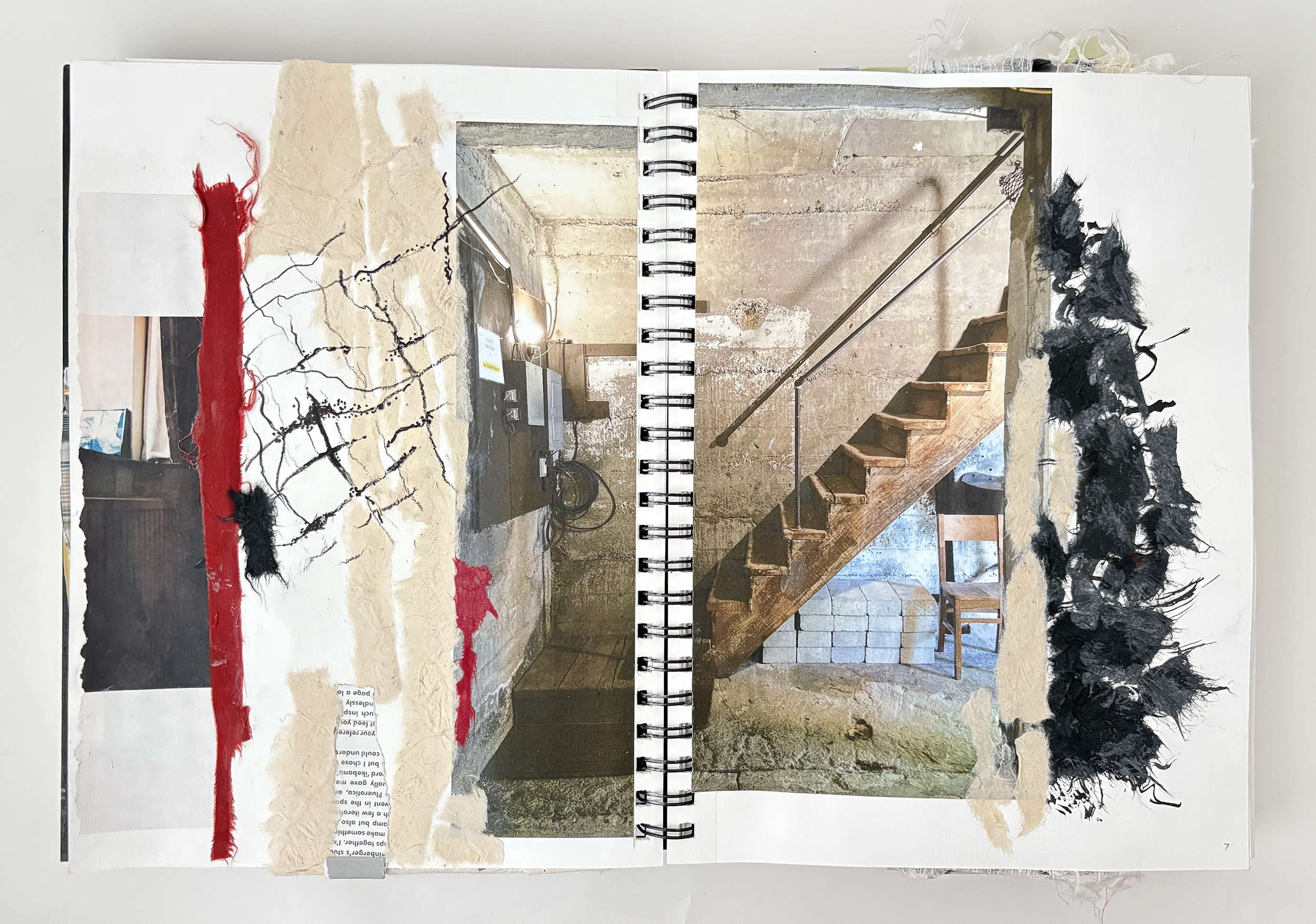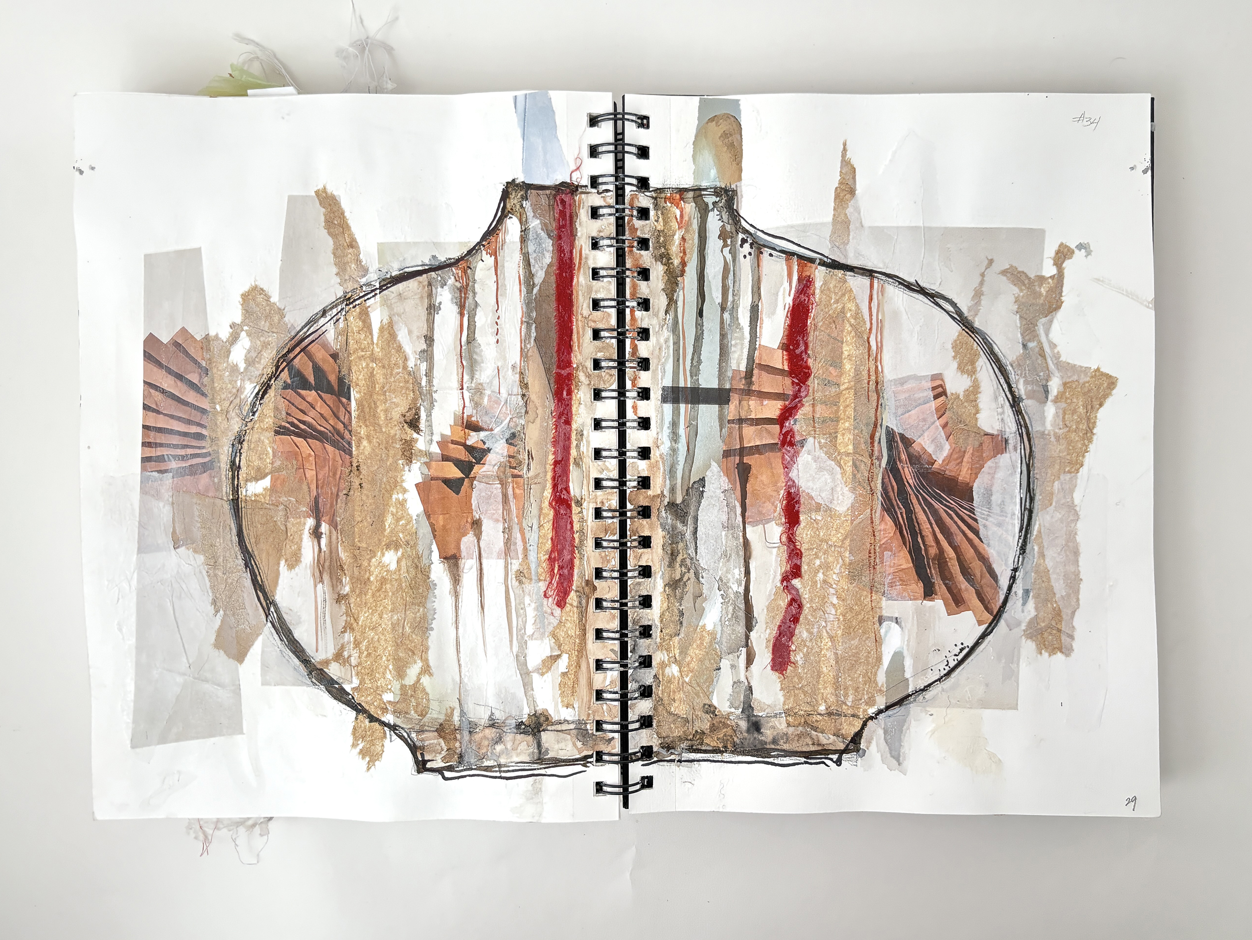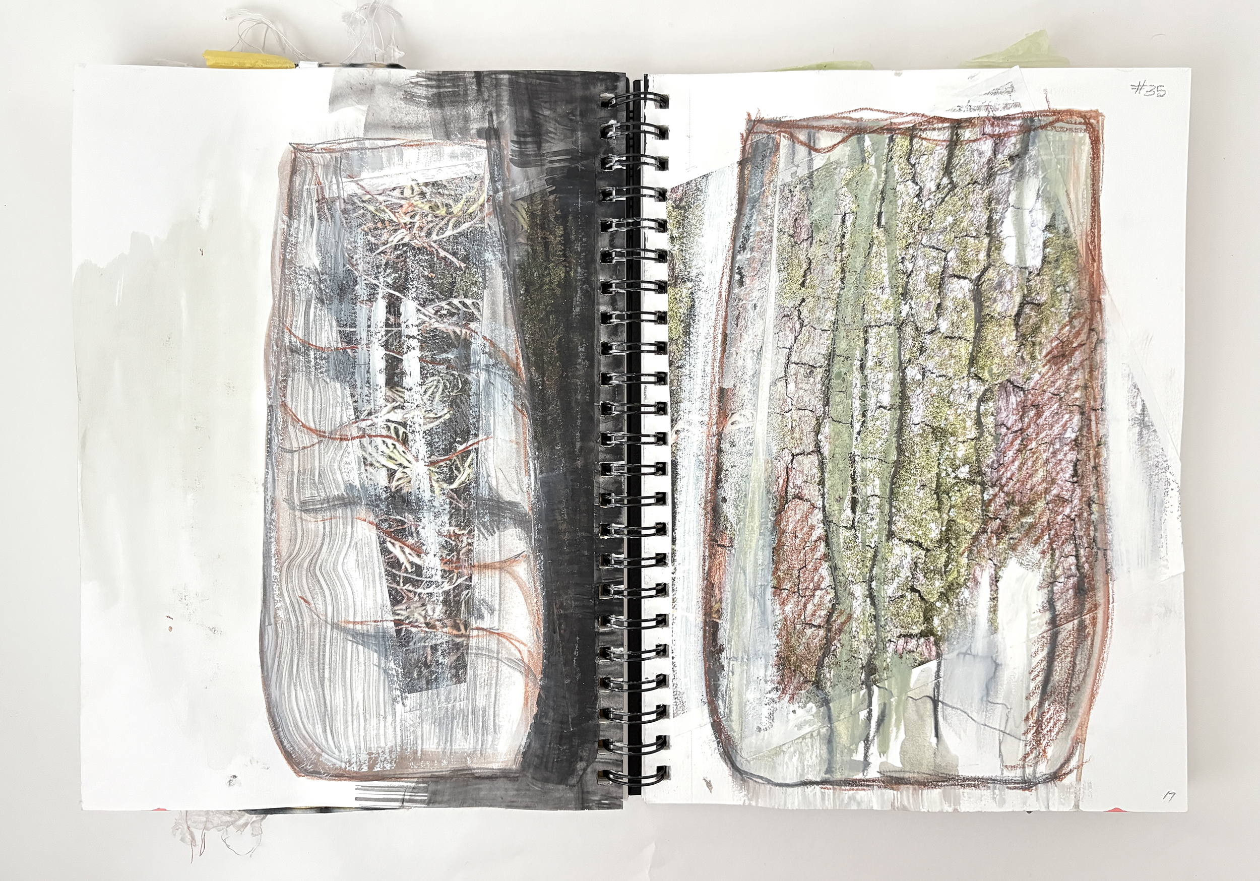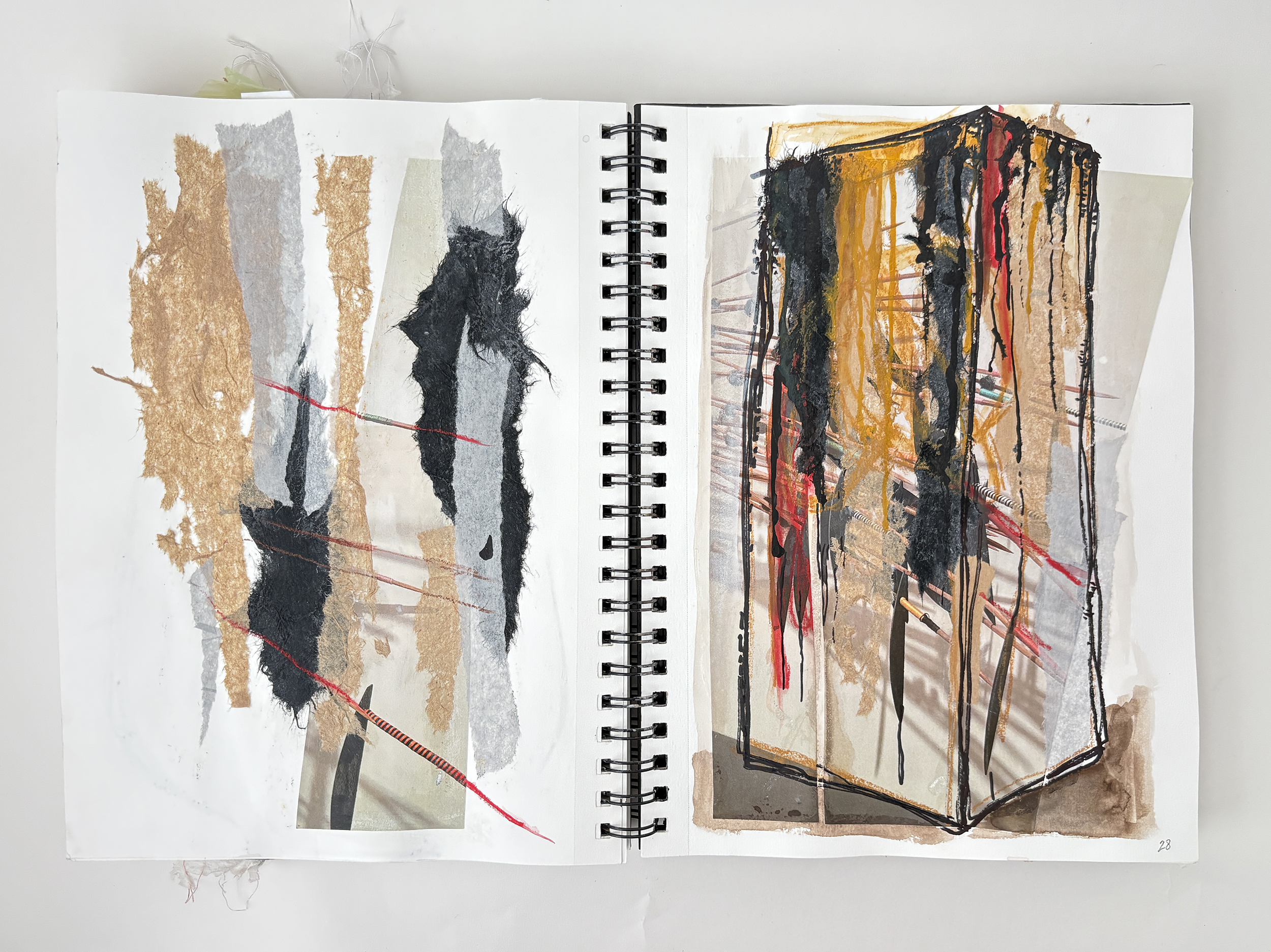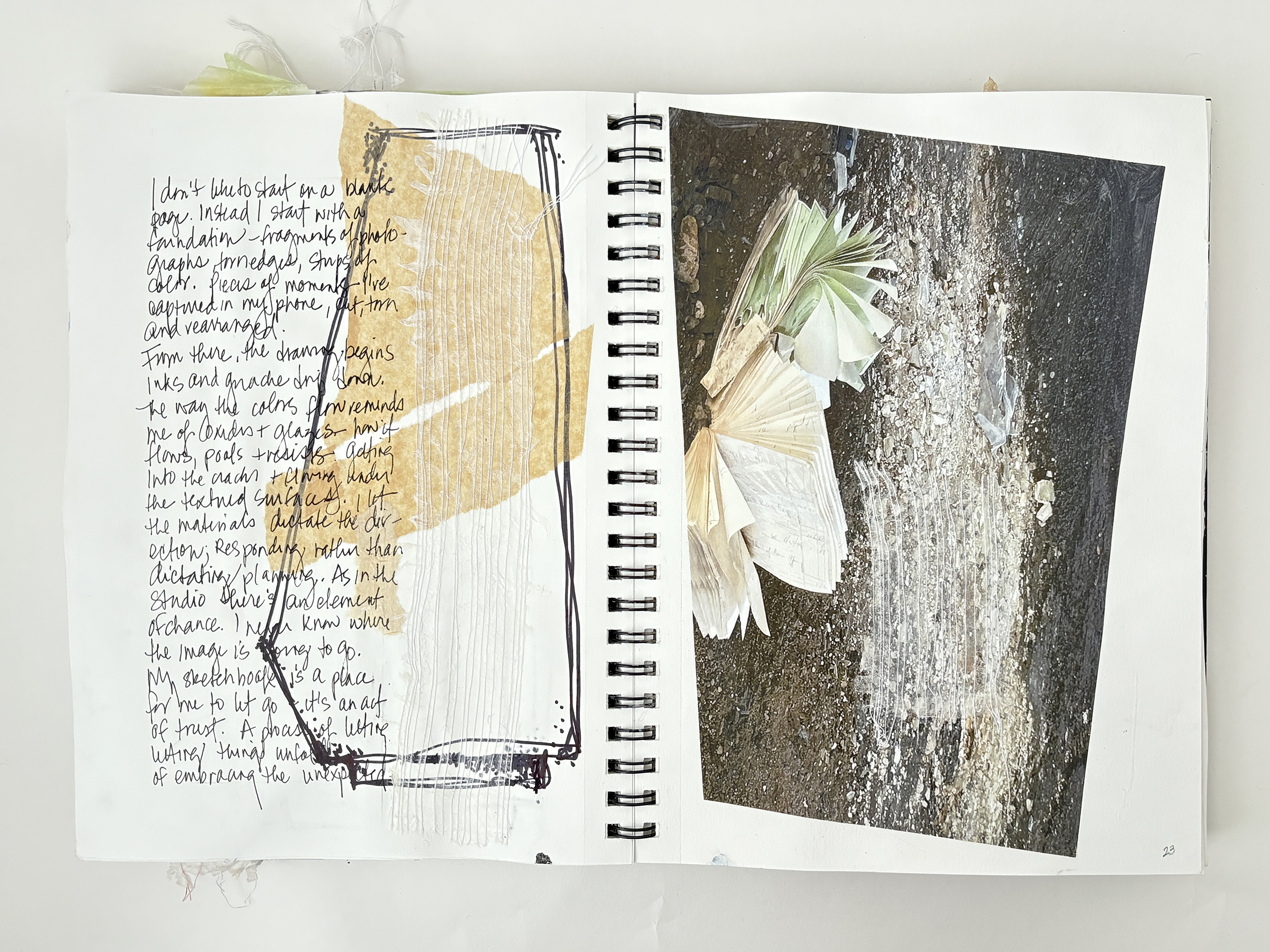 I use my sketchbooks to loosen up. This is a layered process, much like my ceramic work. I begin with collage—fragments of printed photos (most of them are from my phone), torn paper, and found objects—then drawing layers in marker and pencil before adding ink, water color, and guache that drip, bleed, and flow unpredictably, echoing the movement of glaze on clay. This space allows for spontaneity, a place to experiment before bringing ideas into the studio. The interplay of control and chaos keeps the work alive, pushing me to embrace the unexpected. These pages are a record of exploration, a reminder that creativity thrives in letting go and responding to what emerges.