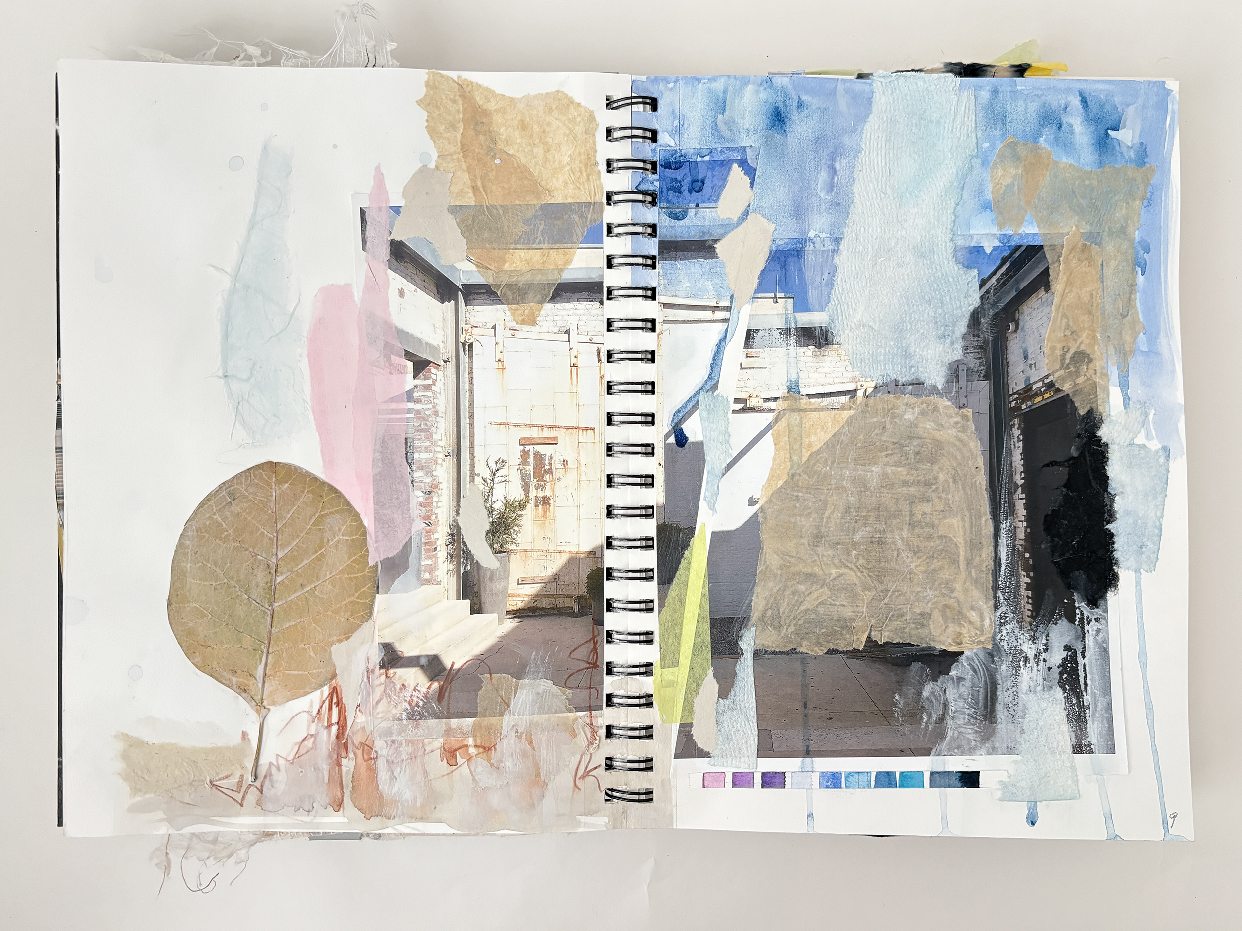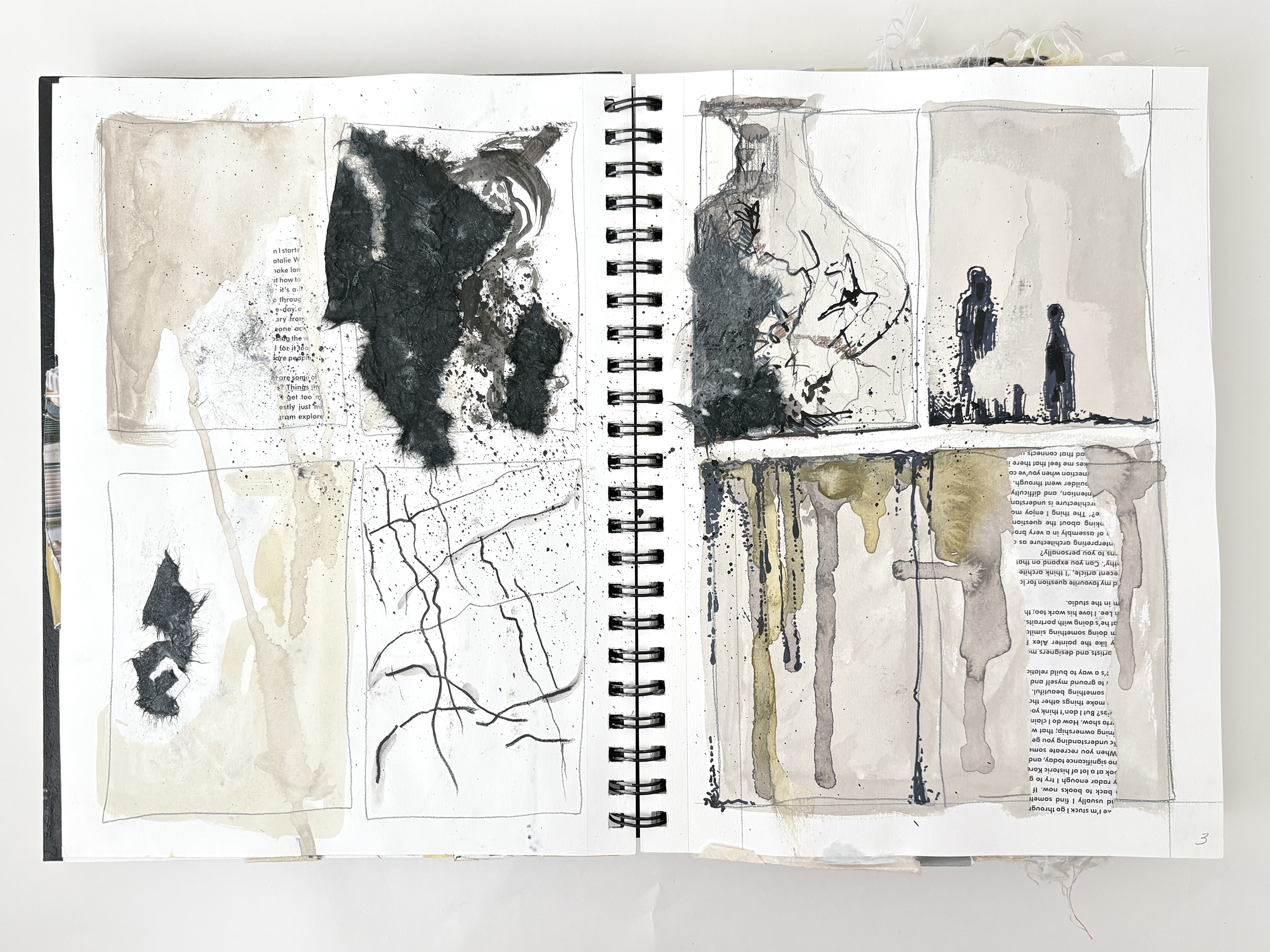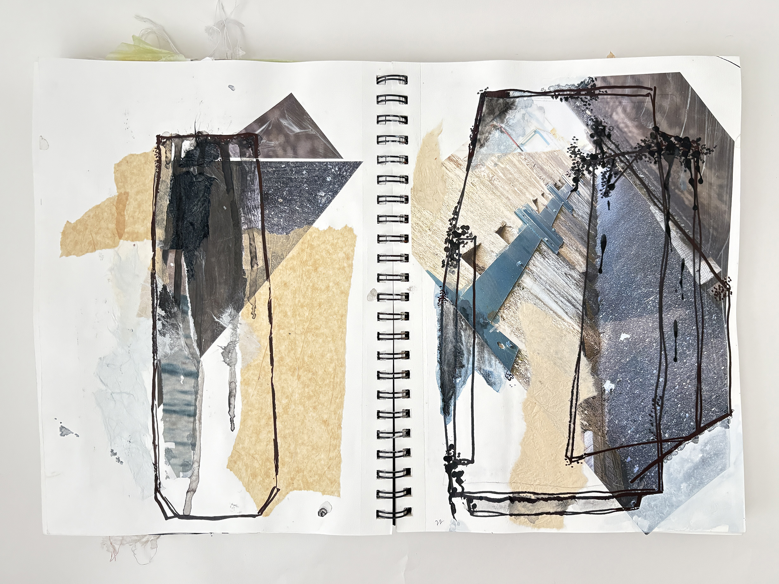 This sketchbook explores refinement and restraint. I still begin with collage, but the compositions are quieter, more deliberate than those of Sketchbook no. 1. Im using less color and thinking more about a palette of whites and neutral colors. Ink and paint flow like glaze, yet there’s a focus on knowing when to stop. By embracing minimalism, I explore how subtle shifts in form and texture can hold the same energy as more complex compositions.