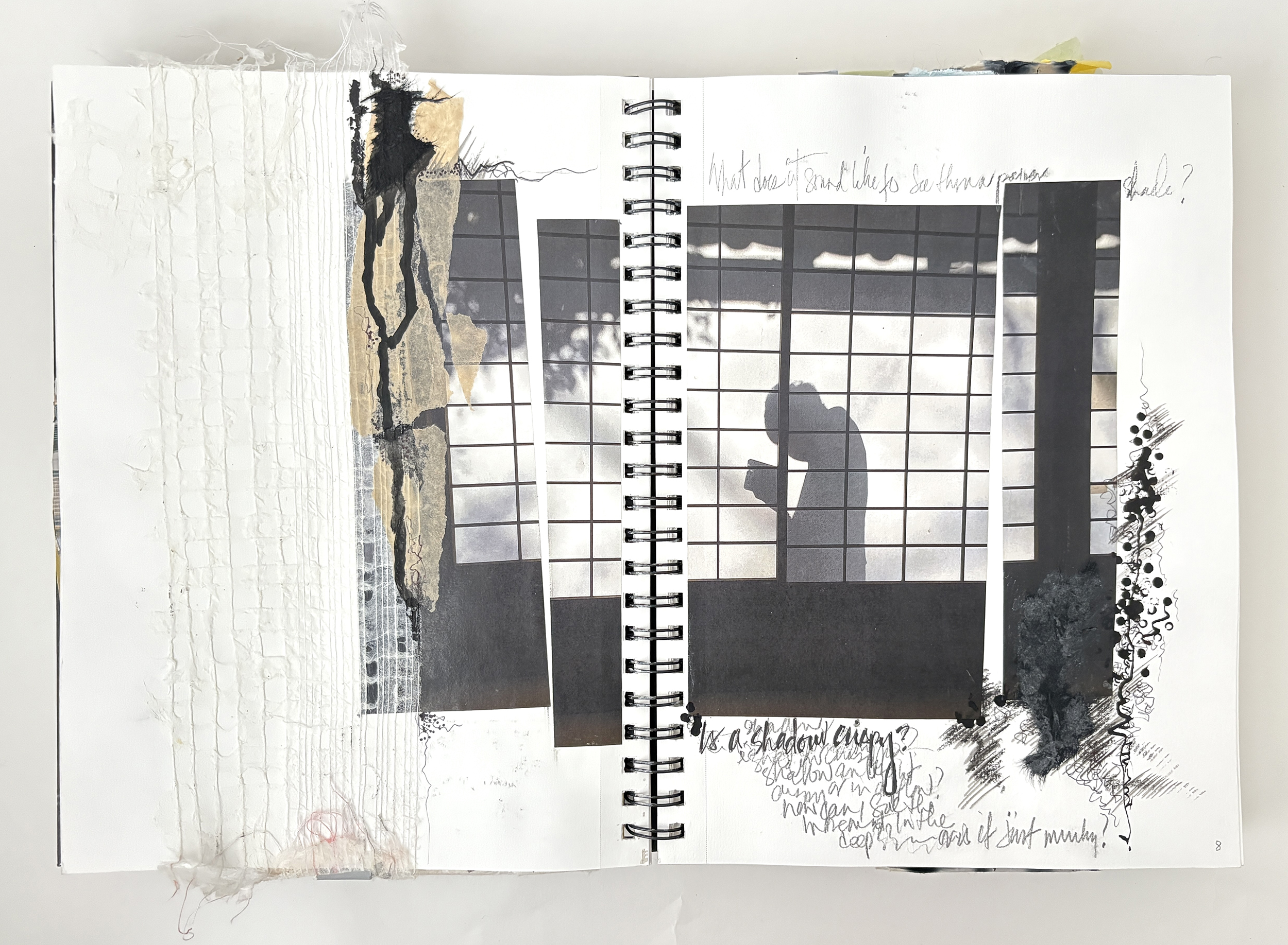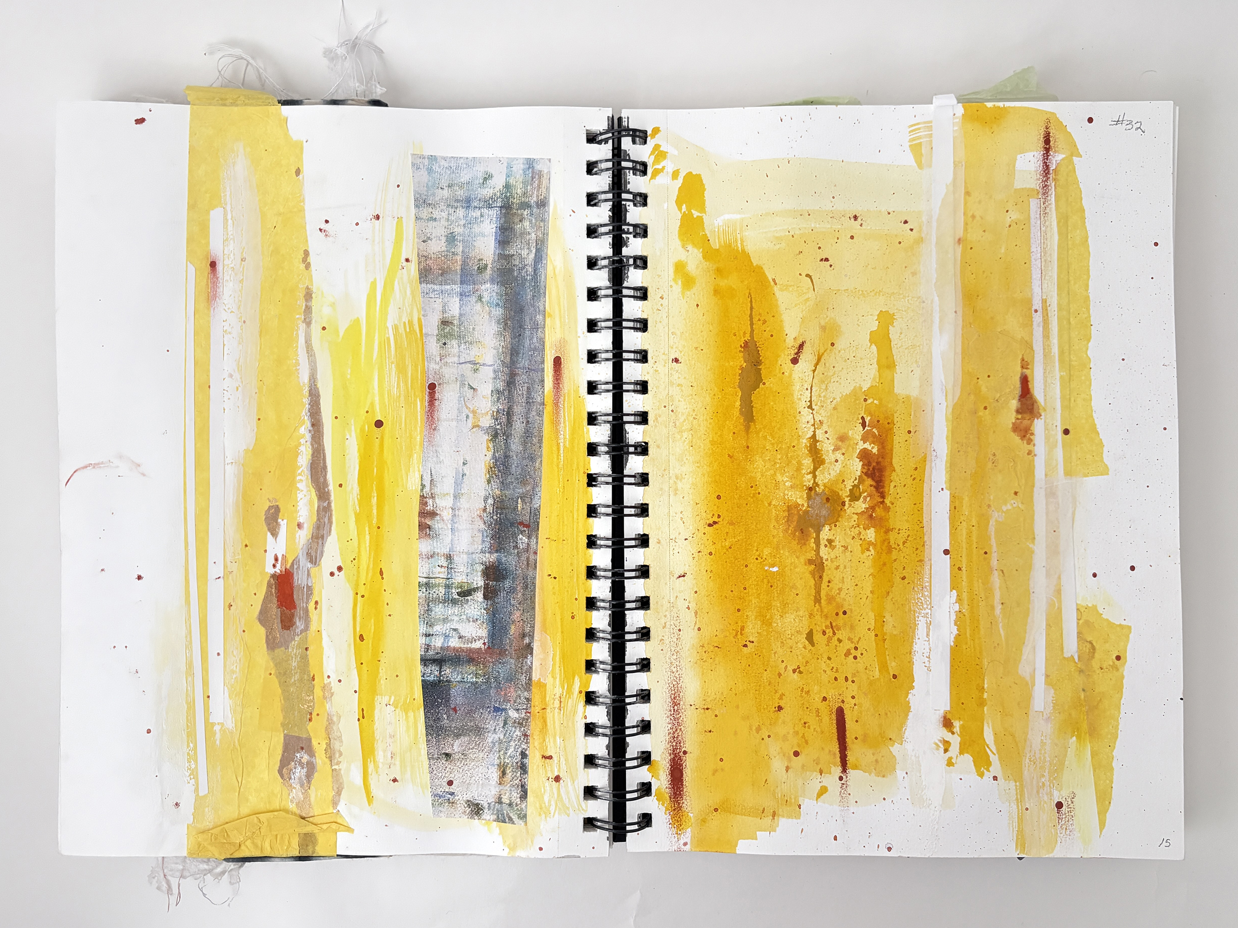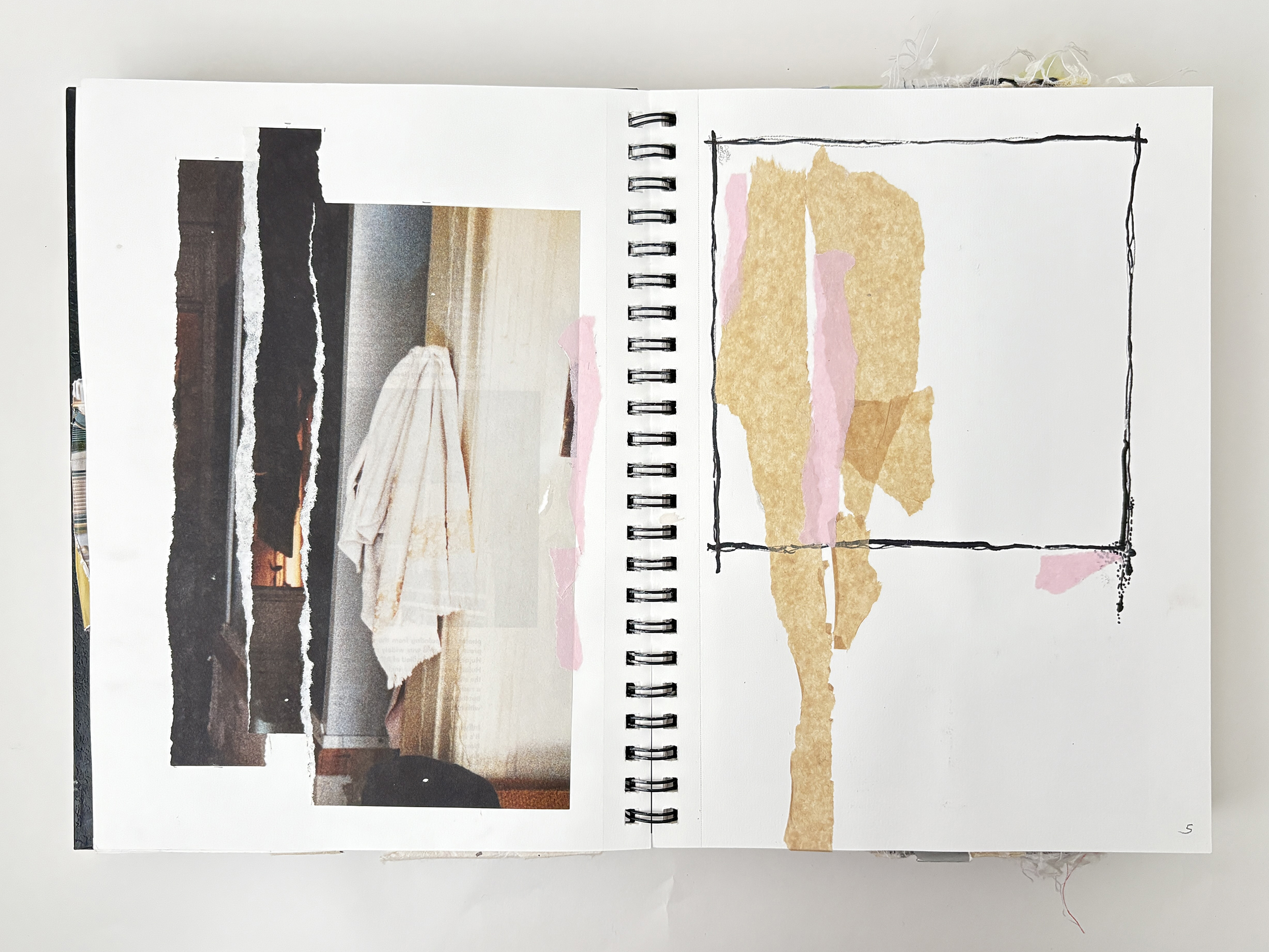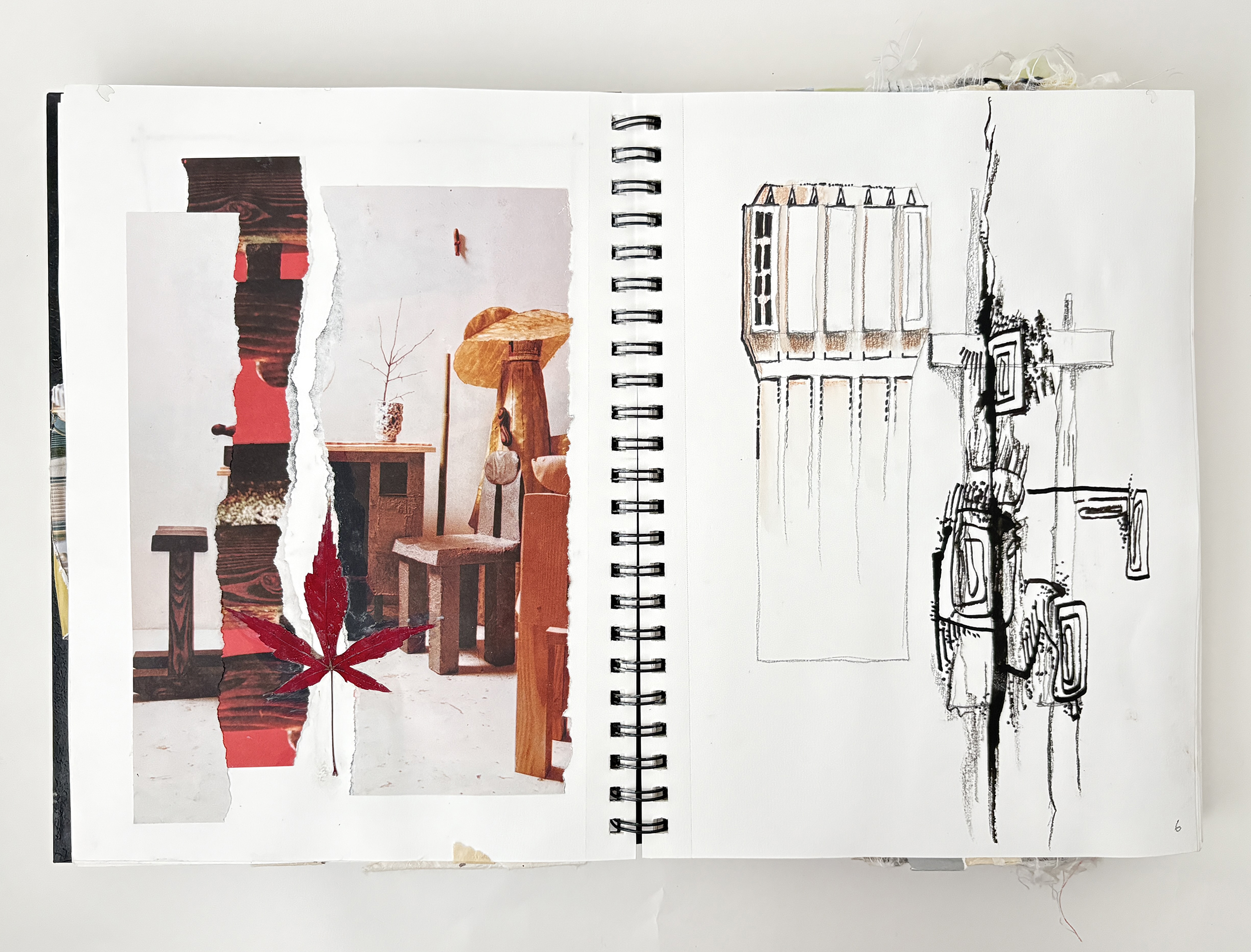 This sketchbook explores refinement and restraint. I still begin with collage, but the compositions are quieter, more deliberate than those of Sketchbook no. 1. Im using less color and thinking more about a palette of whites and neutral colors. Ink and paint flow like glaze, yet there’s a focus on knowing when to stop. By embracing minimalism, I explore how subtle shifts in form and texture can hold the same energy as more complex compositions.